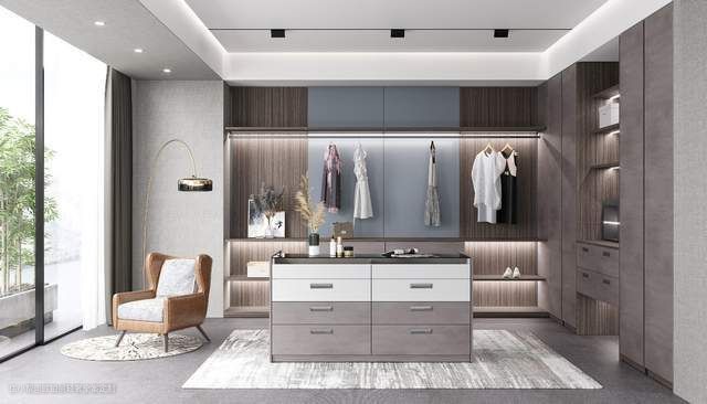 日常穿搭追求风格多变,衣帽间就是展现自我的小天地。L型的衣柜大部分采用开放式设计,挂衣区能轻松搭出不同的OOTD。内嵌灯带增强了视觉享受,中岛的抽屉区,也便于小件物品的拿取和存放。