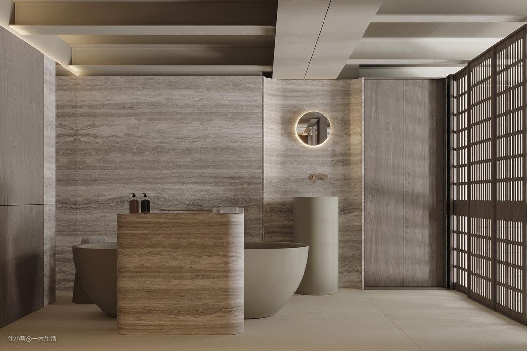 侘寂的设计趋势以中性色调为主,一般都会带有原生态的纹理或质感。洗浴间除了选用与客厅、卧室相一致的原木材质,保持了风格的契合感之外,更是加入石材元素,拔高了整体的原生态气息。