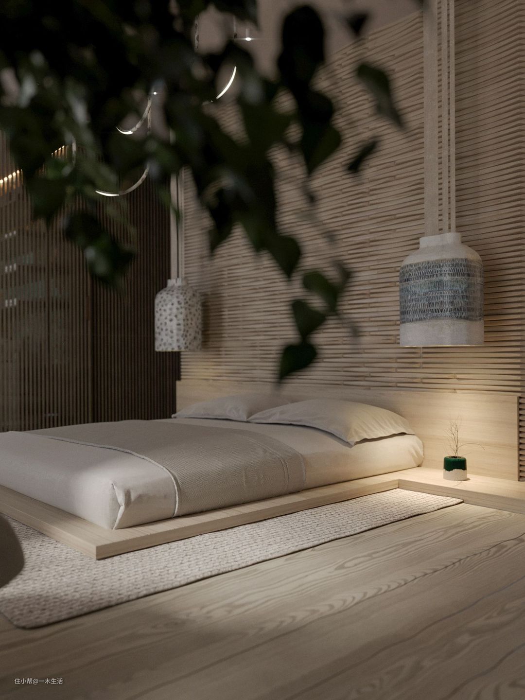 侘寂风属于日式风的分支,所以很多人在设计时,也会参考更广泛、更大众的日式元素。特别是卧室这么一个追求极致舒适与质感的空间,通常都会选用暖色主调来彰显温暖与归属感,而榻榻米也是时下年轻人更加钟爱的选择。
