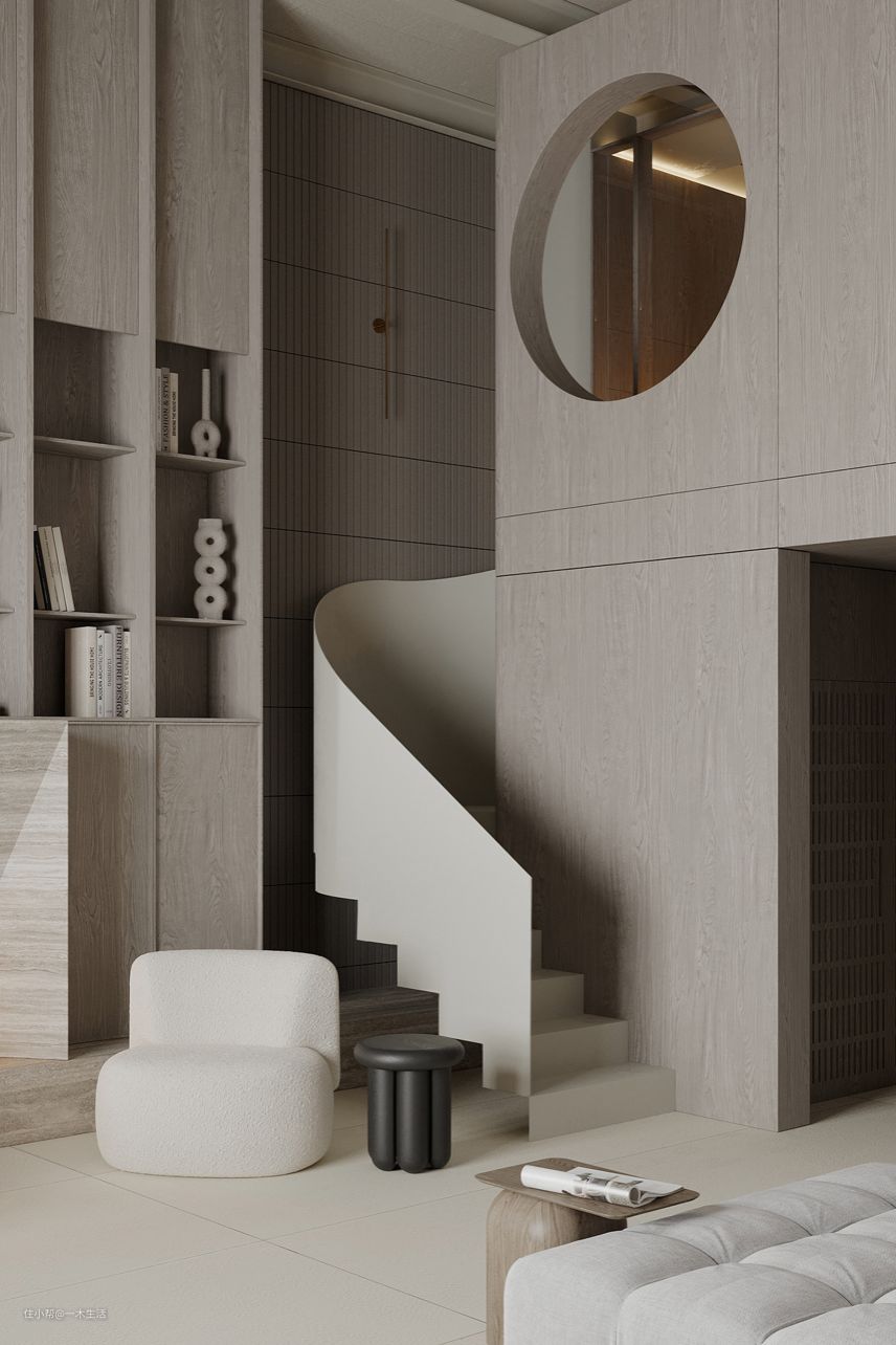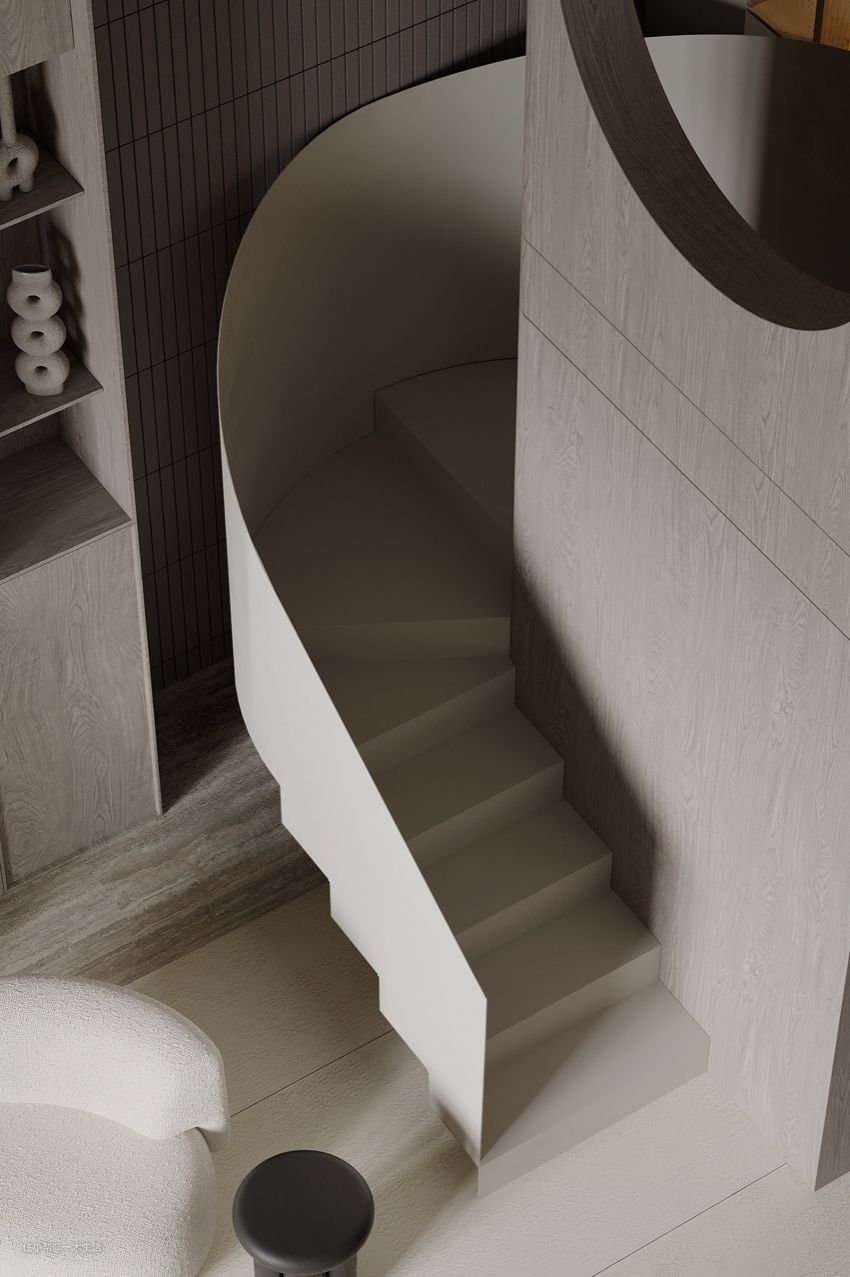 侘寂风在一定程度上遵循着解构主义的设计原则,即用分解的概念,将部件进行叠加、重组,对整体呈现出一种分散却又统一的不确定感。为了使空间视觉上更显柔和纯粹,曲线、曲面在侘寂家装中的运用非常广泛。正如楼梯的扶手,在视觉上呈现出流畅之感,曲线设计既融于空间整体,又独具个性。