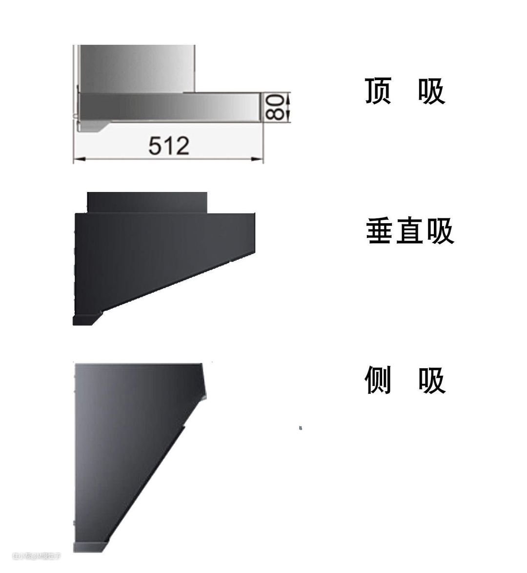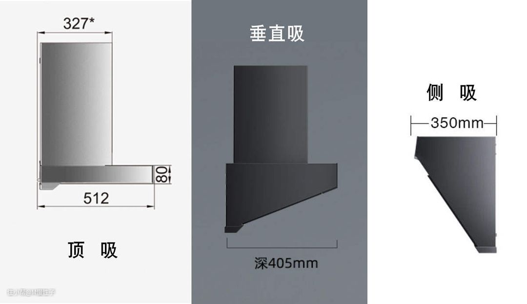 ▼从对比图看到,垂直吸,同样采用类似顶吸的顶置电机,相比于侧吸,能做到更高的排风量,一般中高端垂直吸能做到22m³/min,而侧吸最大也就在18m³/min左右。电机上置运行更稳定噪音更低。而垂直吸的拢烟罩深度介于顶吸和侧吸之间,这样既不会碰头,也能更好的吸烟。最后它的吸烟口比顶吸的离灶头更近,也能起到近吸的效果。可以说是目前最理想的油烟机结构。