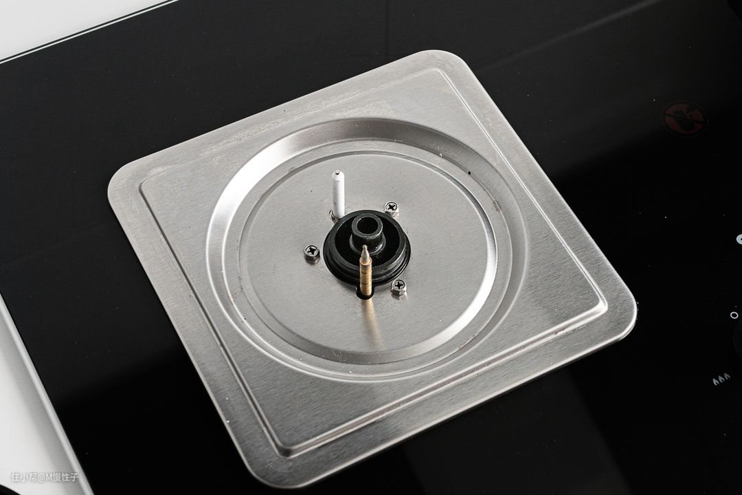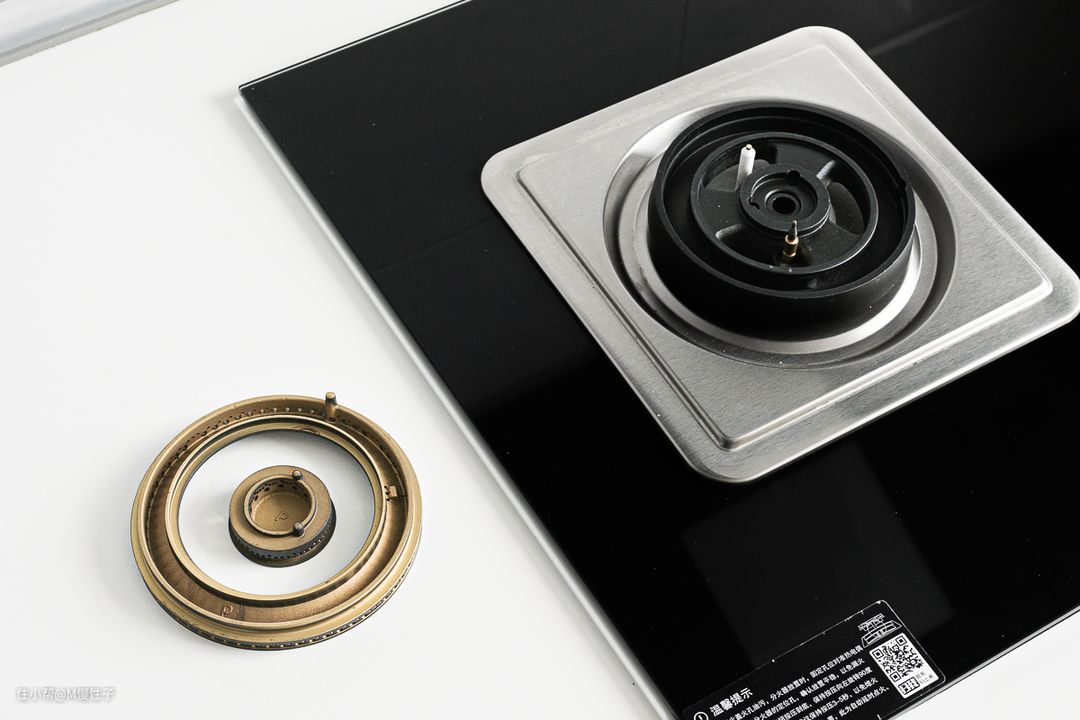 ▼再来看看灶具的部分吧,面板是黑色的钢化玻璃,配合不锈钢的盛液盘,以及全铜的火盖,观同样简洁时尚