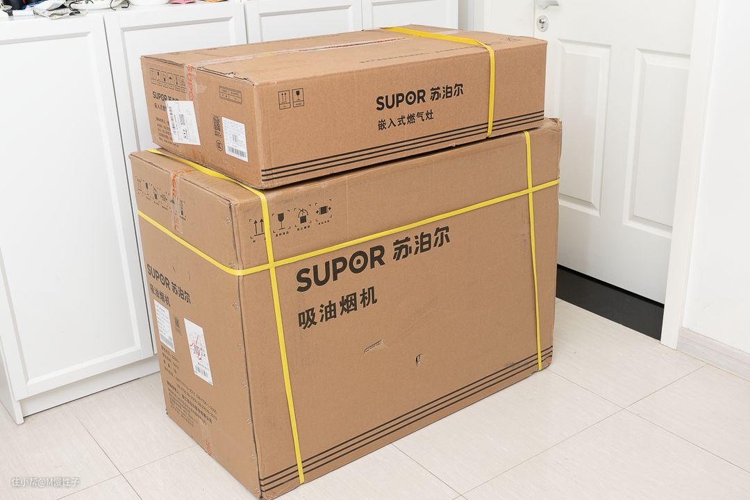 ▼先来看看产品的开箱和外观吧!油烟机和灶具是分开包装,环保的黄板纸材料,有送货上门。