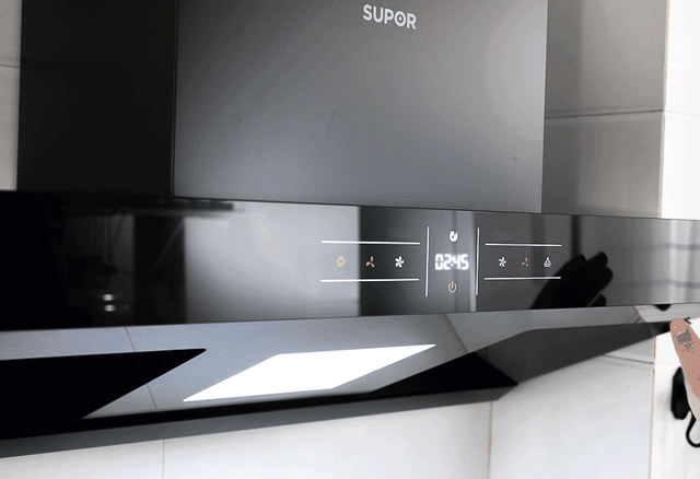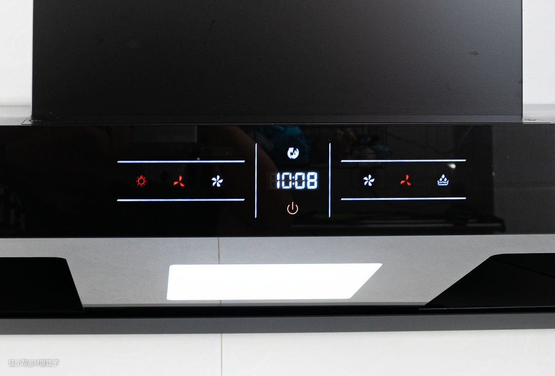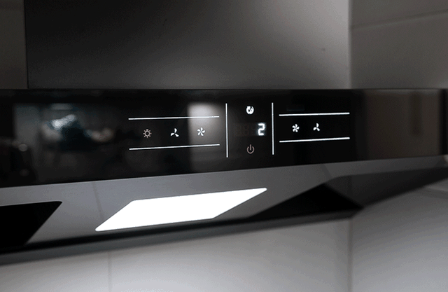 ▼控制部分采用了触控屏设计,左右侧烟道可以分别控制风力的大小,有时间的显示以及自清洁的开关