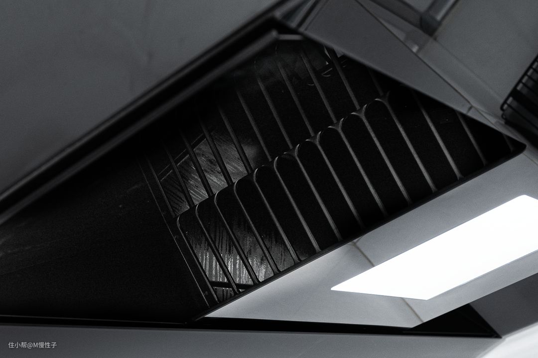 ▼侧面的包边采用了哑光的喷漆材质,也非常有质感,从侧面也可以看出这是典型的垂直吸结构,电机上置,拢烟罩相对传统顶吸式更短,不容易碰头,吸烟口离灶具更近,吸烟效果会更好。