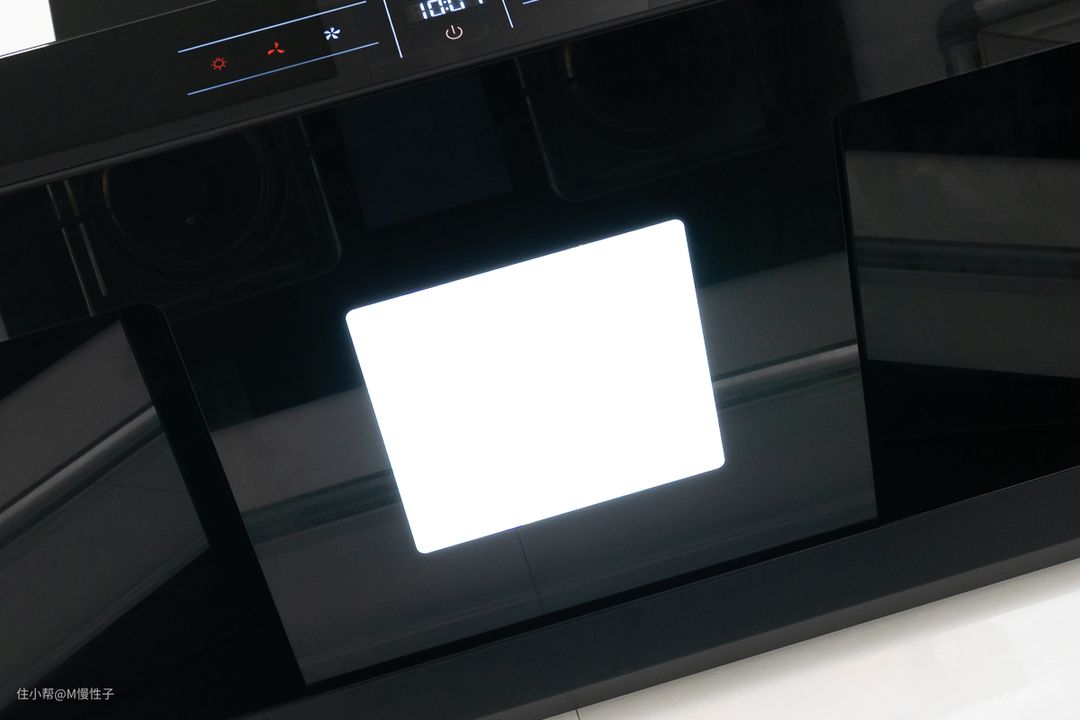 ▼烟机中间配有舞台式照明,LED冷色矩阵光源,视觉舒适,还能最大程度还原食物本来的颜色。相比于传统油烟机的小圆灯,它的面积要大得多,照明效果也更好