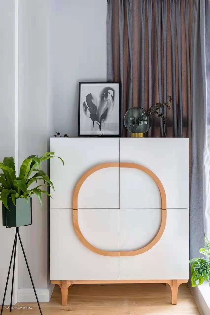 进门的一侧为落地窗,为了不影响采光而只放了一个白色矮柜。通过绿植、装饰画点缀,整个玄关显得简约舒适。