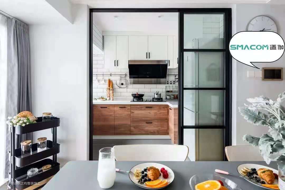 厨房门的选择也有讲究,黑框玻璃门保证空间隔断的同时,还可以让光线充足,还能增加餐厅与厨房的互动,一举三得。
