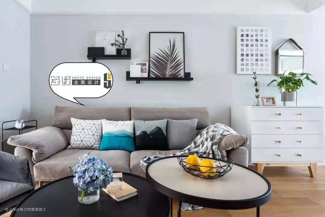 北欧风的客厅,选择了灰蓝色的墙面,黑色搁板上墙,既是装饰也做收纳,实用与美观兼具。客厅的杂物收纳,就用边柜解决。