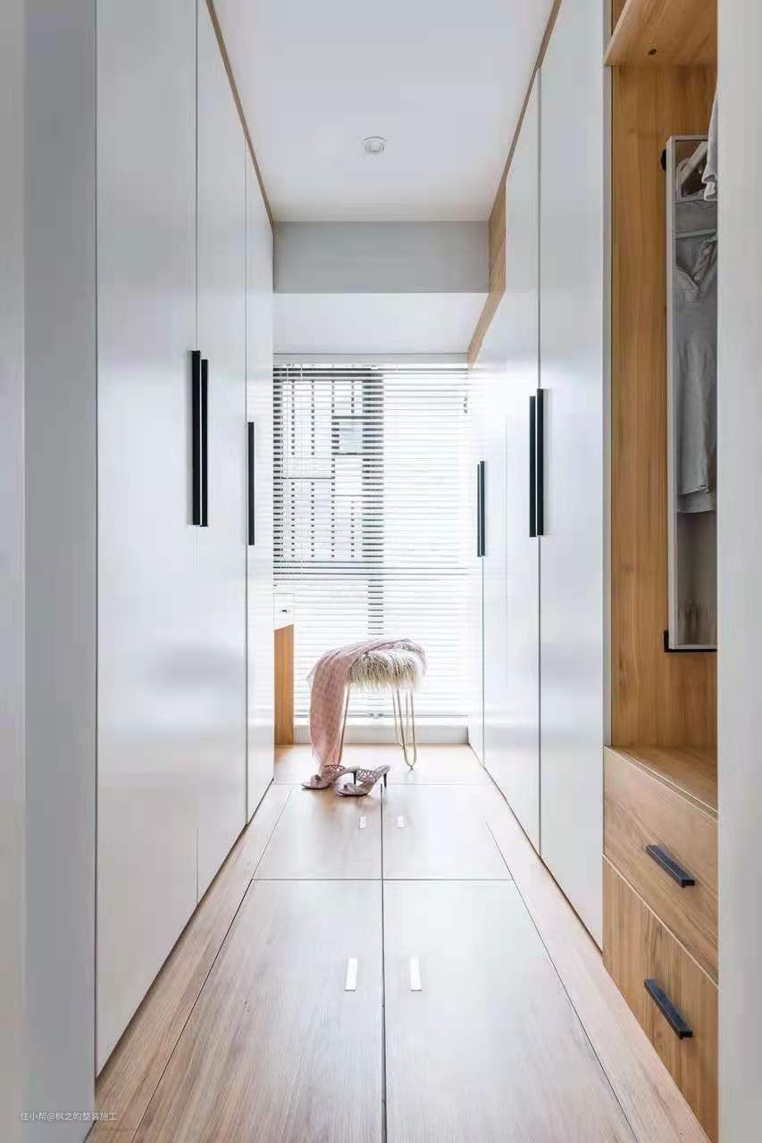 长方形衣帽间,利用靠窗的位置设置梳妆台,整齐的衣柜满足衣物的收纳需求。