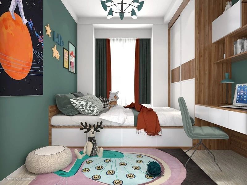 这房间的小主人是一位小王子,他从小的愿望就是要做一名宇航员,所以房间设计师有星球元素,另外,为了腾出更多的地面活动空间,家具做贴合墙面的定制,书桌、柜体和床由边角向两边墙面延伸。