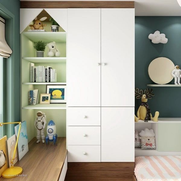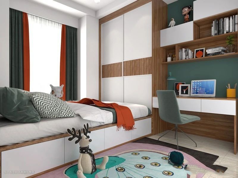户主的女儿上小学了,需要一个独立的房间,设计师特意针对户型格局,在窗边沿着墙面,定制集合书桌、书柜、衣柜和床的L字型组合床,床底下还带抽屉,可以收纳孩子的大小玩具。