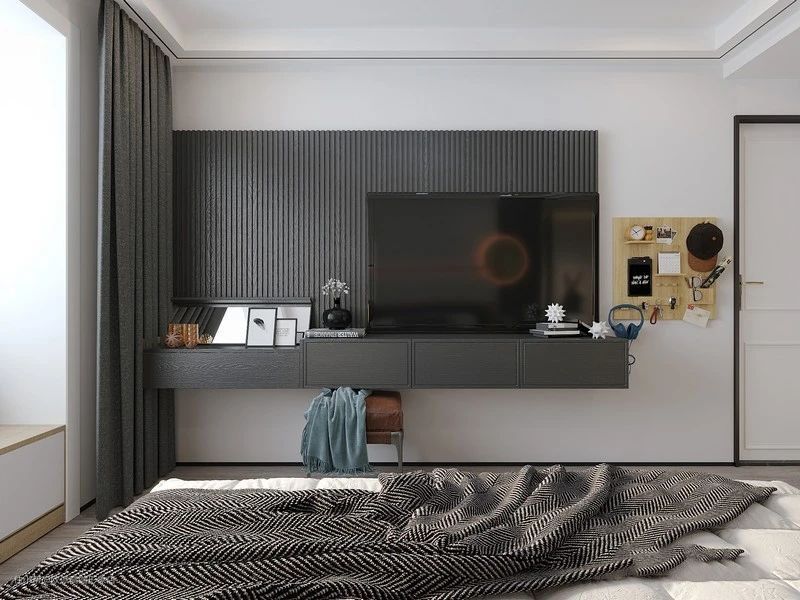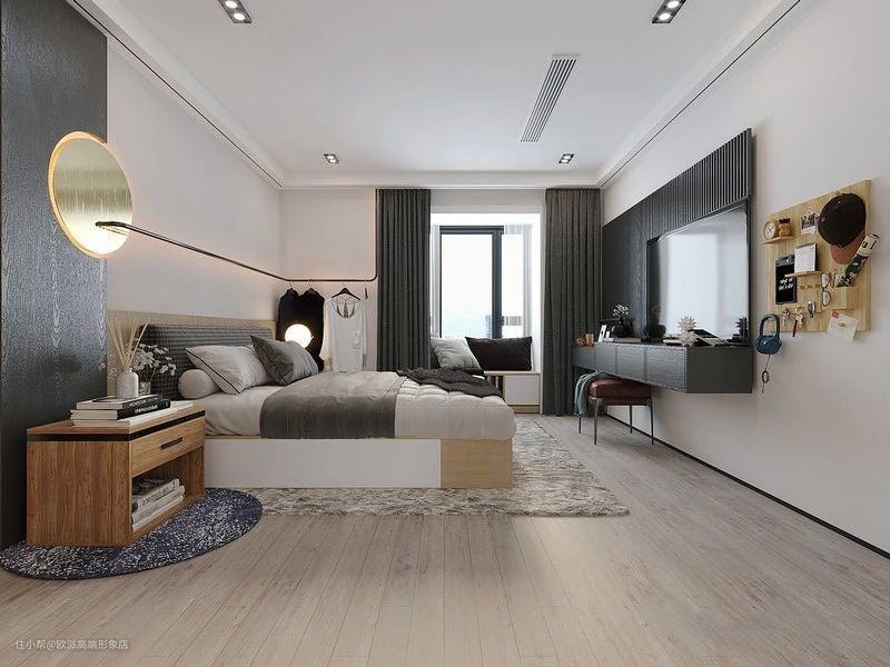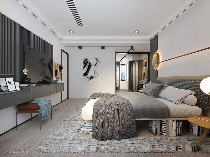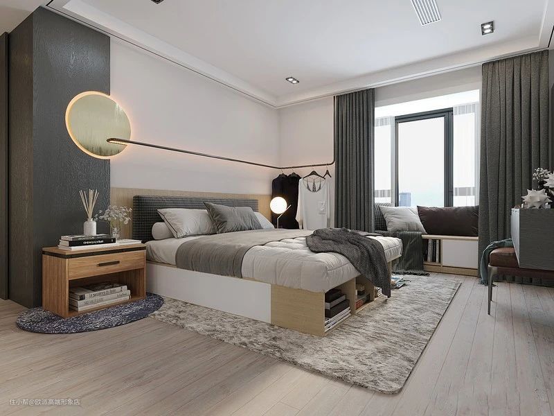 下面这个单身主卧案例是一个工业风格的带衣帽间套房,工业风设计简洁无华却不失格调。功能性方面也考虑周详,飘窗两柱之间定制了飘窗柜,还有延伸式的柜体设计和床头的可收纳钢管装置互相呼应,又具备功能性。
