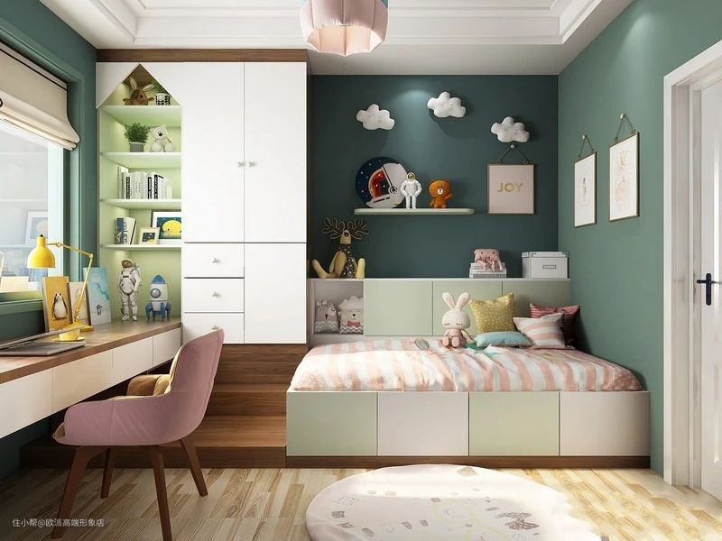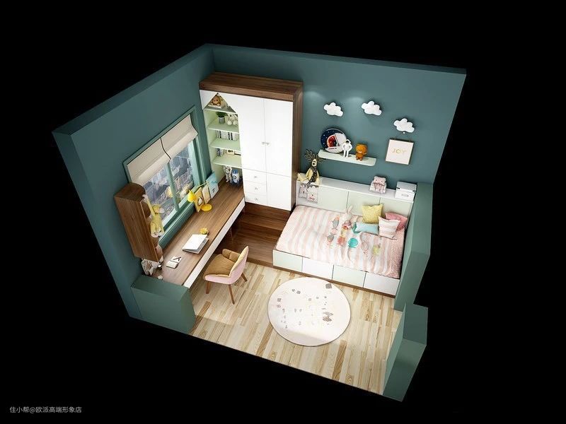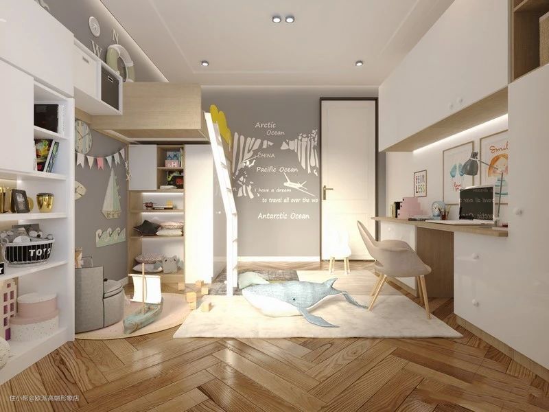 宝宝活泼好动,喜欢跳舞又喜欢画画,无奈空间有限怎么办?下面这个案例绝对值得参考。儿童房做定制,将占地方的床铺移到上空,腾出更多的活动空间给孩子,任她唱跳。
