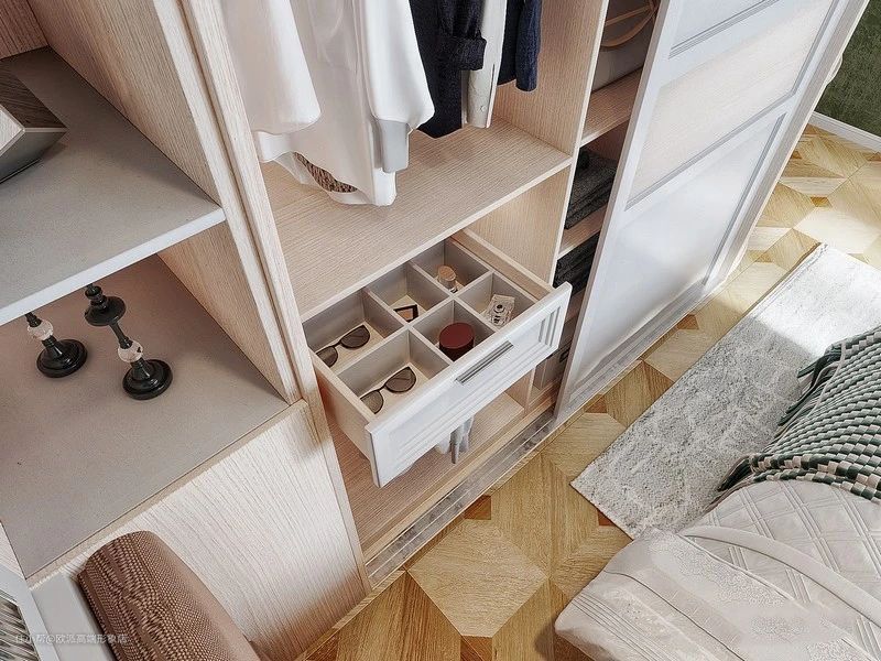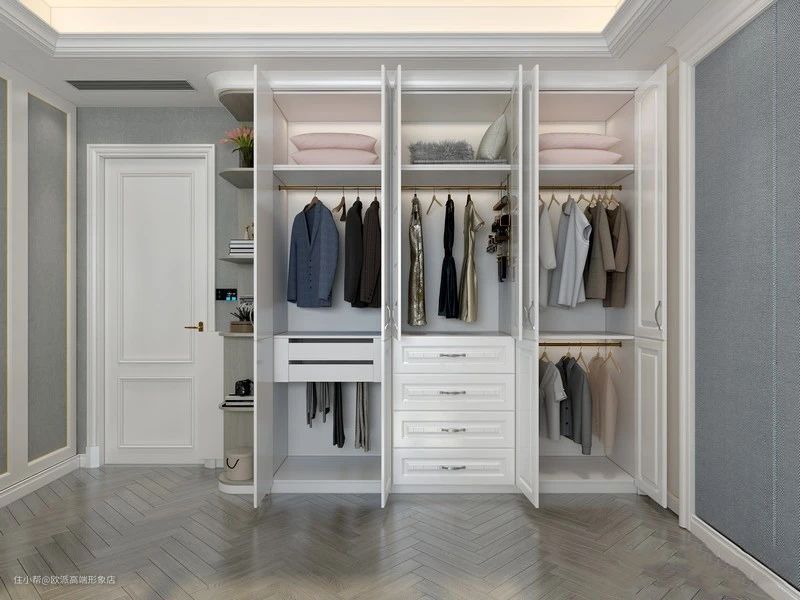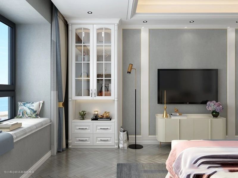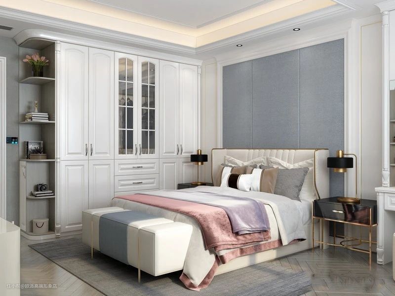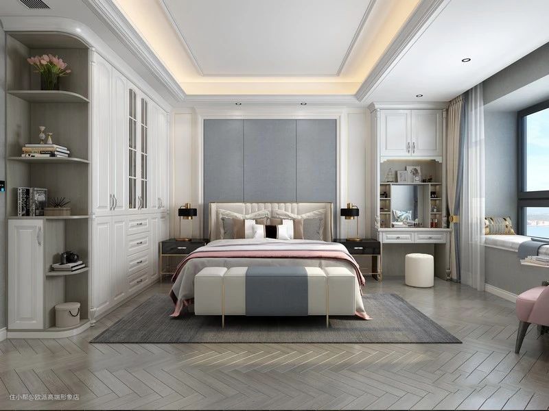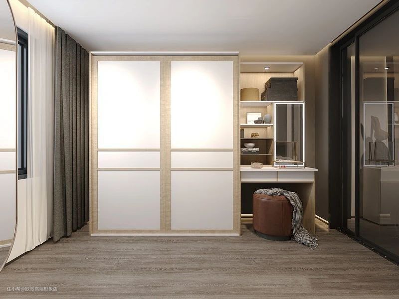 设计师为简欧风格的卧室定制了精致的到顶衣柜,还将衣柜分为三个区域,左边1格和右边2格分别是男女主人的衣物收纳区域。连前后的边角都有功能分区,一侧是梳妆台,一侧是阅读休闲角。