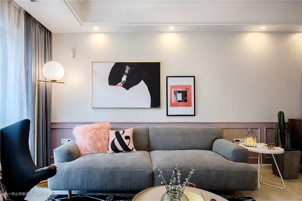 浅灰色瓷砖是一种烟道颜色,乳白色乳胶漆,沙发背景墙是浅灰色,简约的背对天花板,白色裙子,白色沙发,也是墨水绿色装饰绘画和枕头颜色教区,整体看起来干净整洁。
