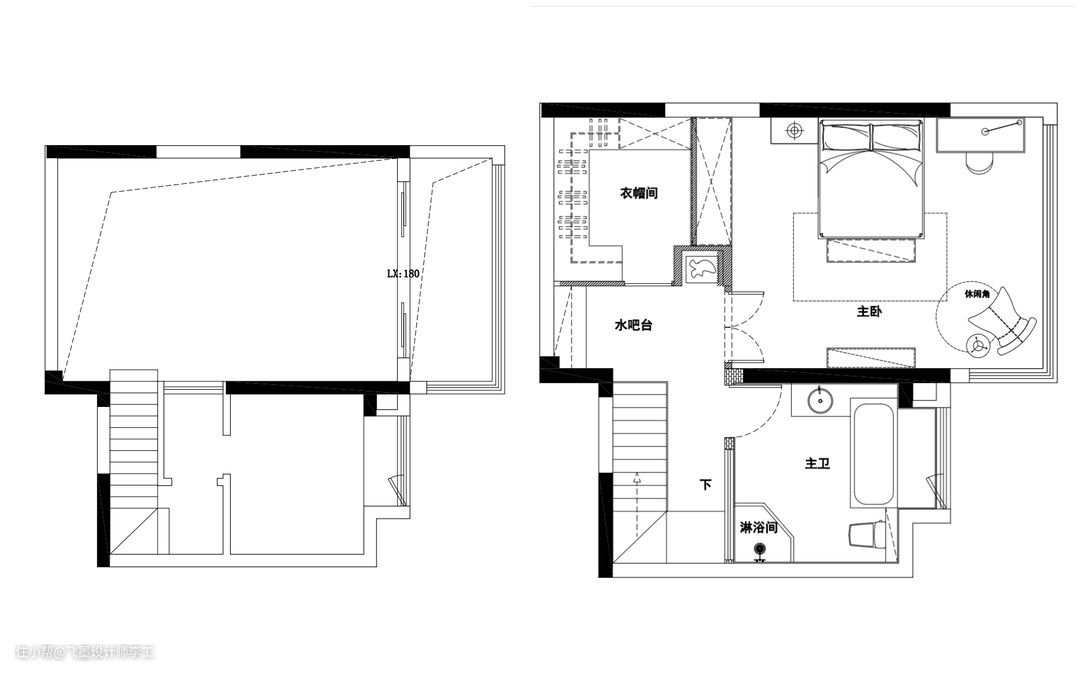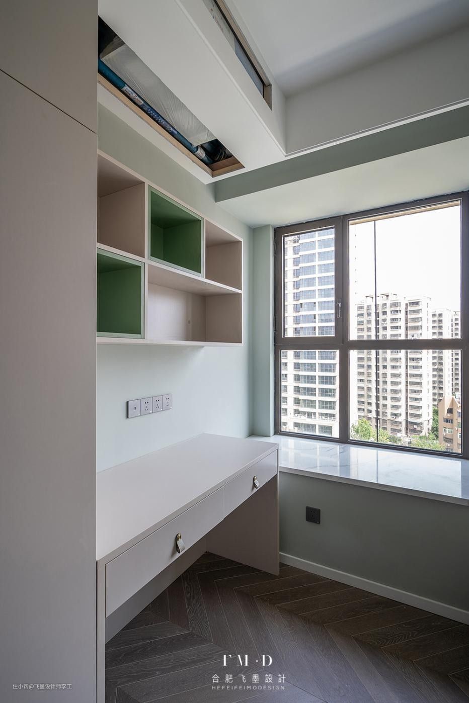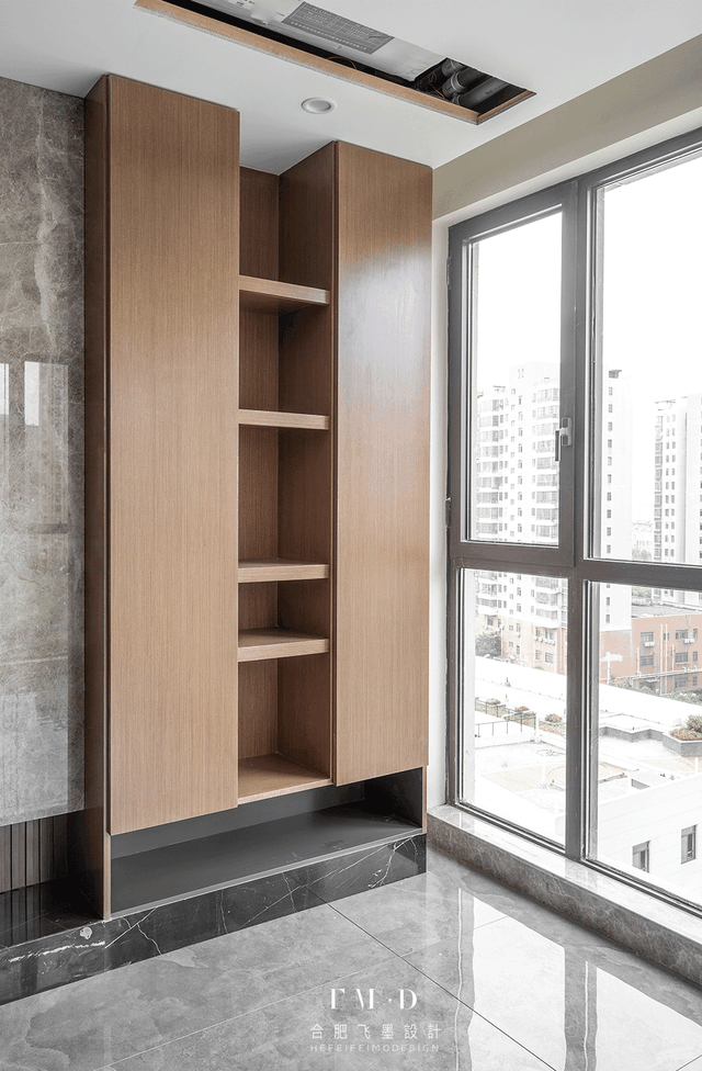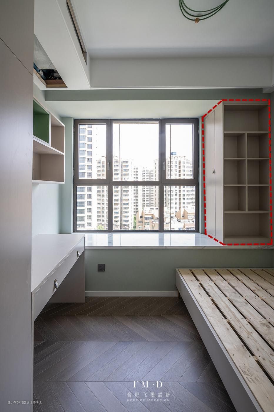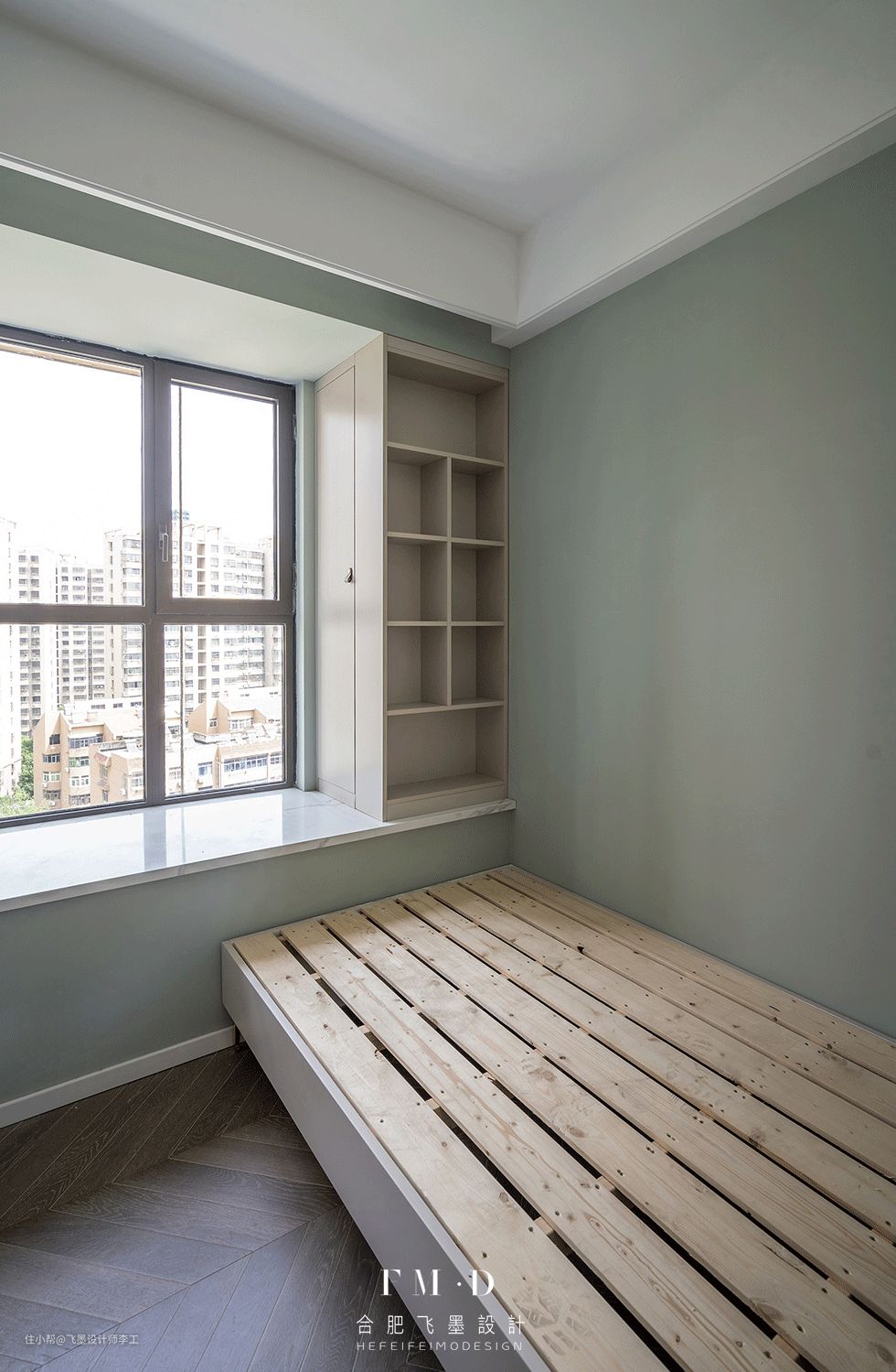 另一边还有个小飘窗,铺上垫子就能改成休闲区,临窗而坐,视野很不错,右侧打个柜子,两边都能进行收纳,靠床的开放式储物格可以代替床头柜使用。