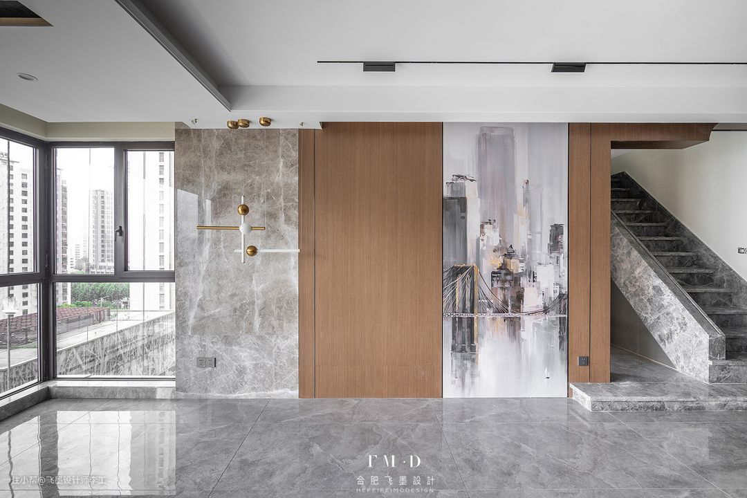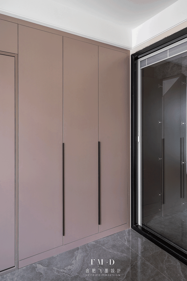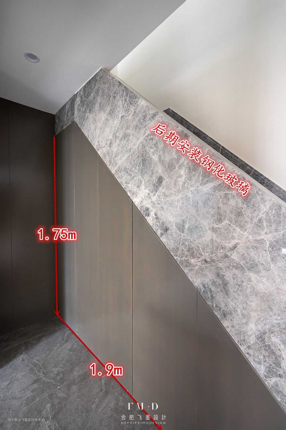 通往二楼的楼梯下面空间不能浪费,沿着楼梯打个长1.9m,高1.75m的柜子,能存放不少物品,对面还有多功能空间,设计师特地选择了玻璃推拉门,保证楼梯间的采光。