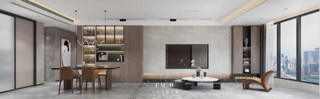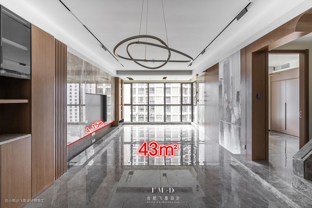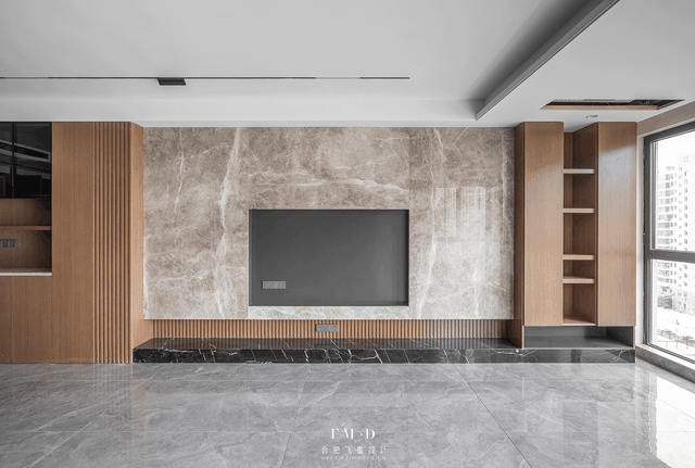 他家客厅一共43㎡,空间特别敞亮,4.15m长的电视背景墙选择天然大理石材质,花纹好看又有档次,壁挂电视内嵌其中,一点也不占地。