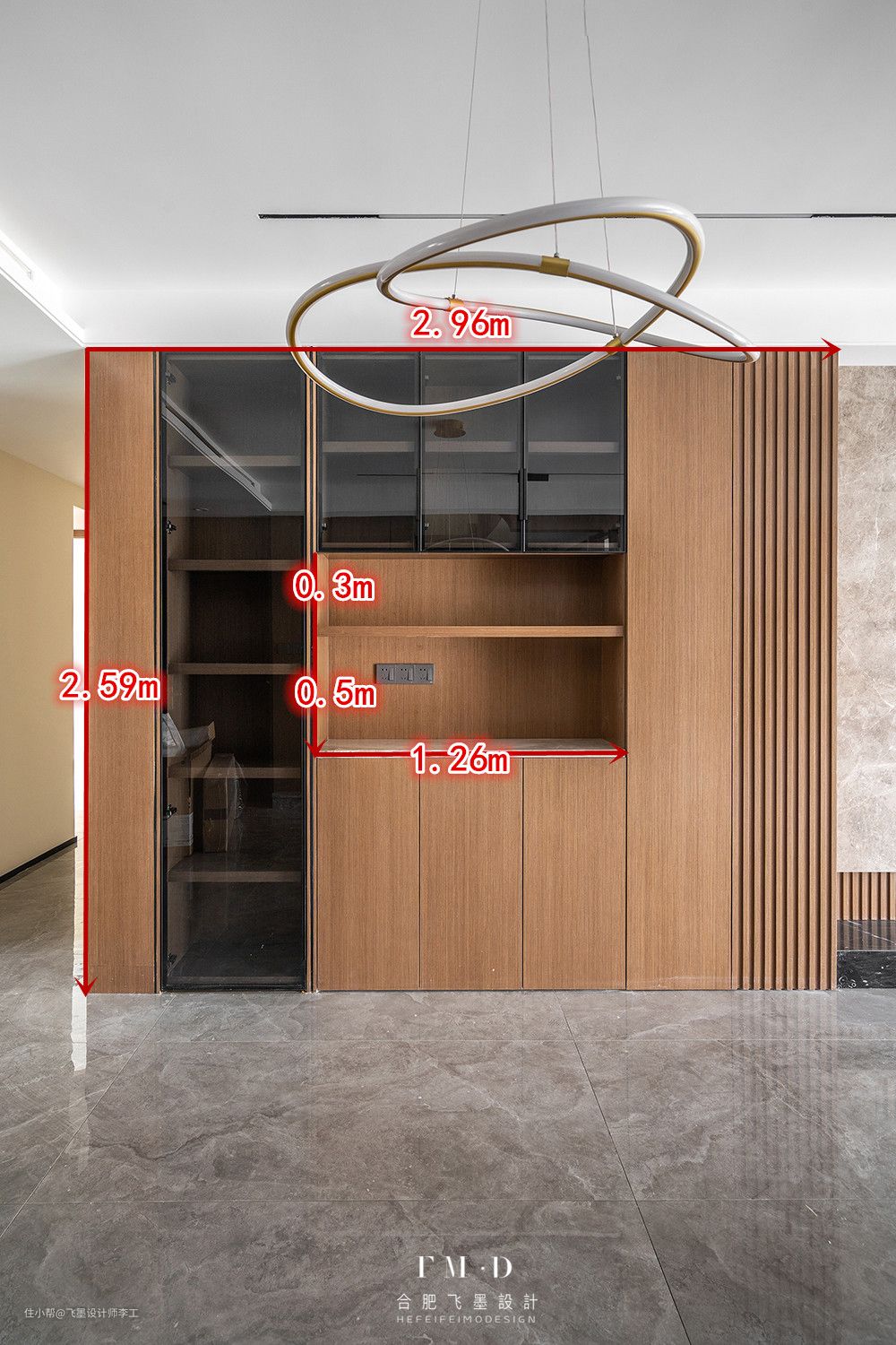 餐厅跟厨房中间只隔个过道的距离,端菜比较方便。墙边打个长2.96m的餐边柜,高度2.59m。中间预留1.26m的长度做台面,中间加块隔板一分为二,上面高30cm,下面高50cm,可以根据物品的高度来进行摆放。