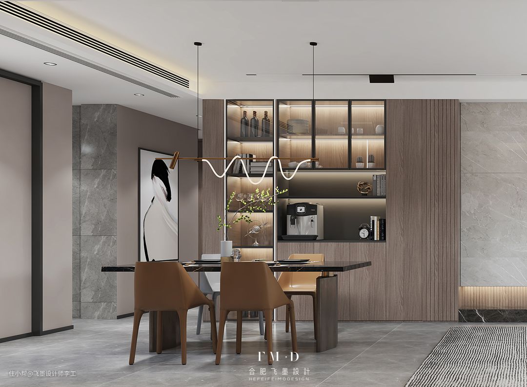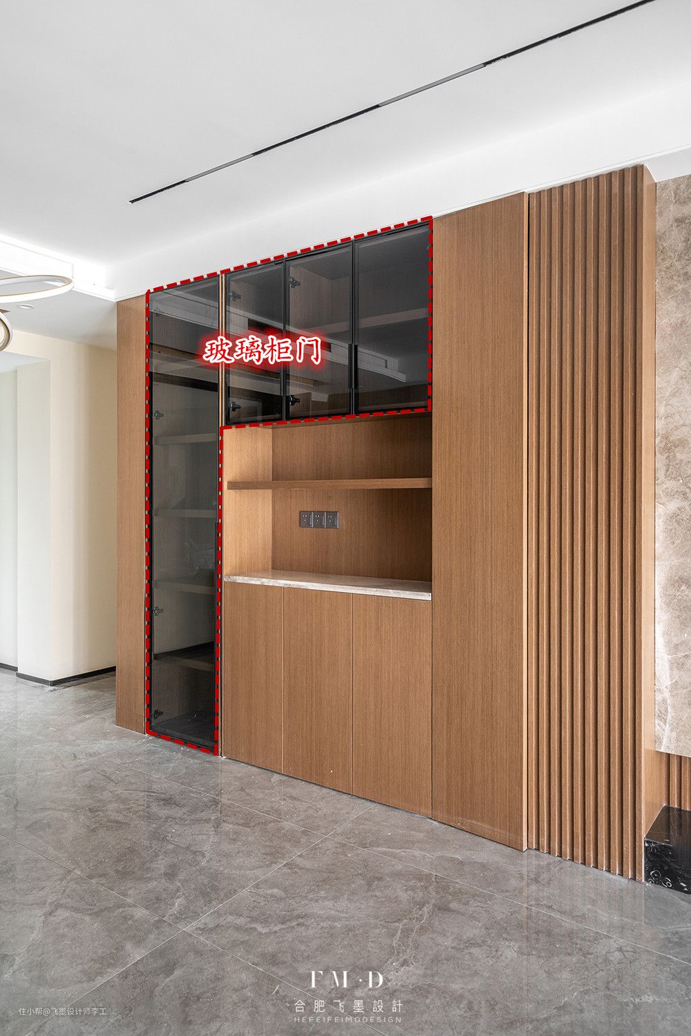 餐边柜整体右侧是封闭式柜子,左侧则选择了玻璃柜门,既能作为展示又不用担心落灰,如果家里有收藏需求可以借鉴一下,显得比较高档。