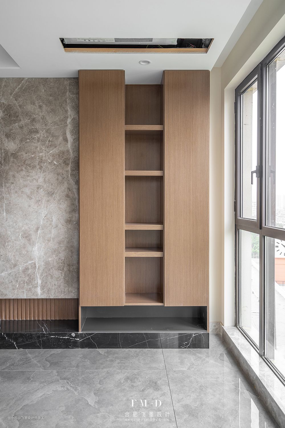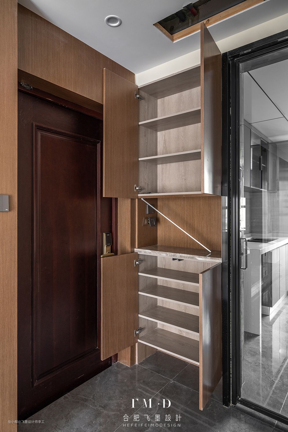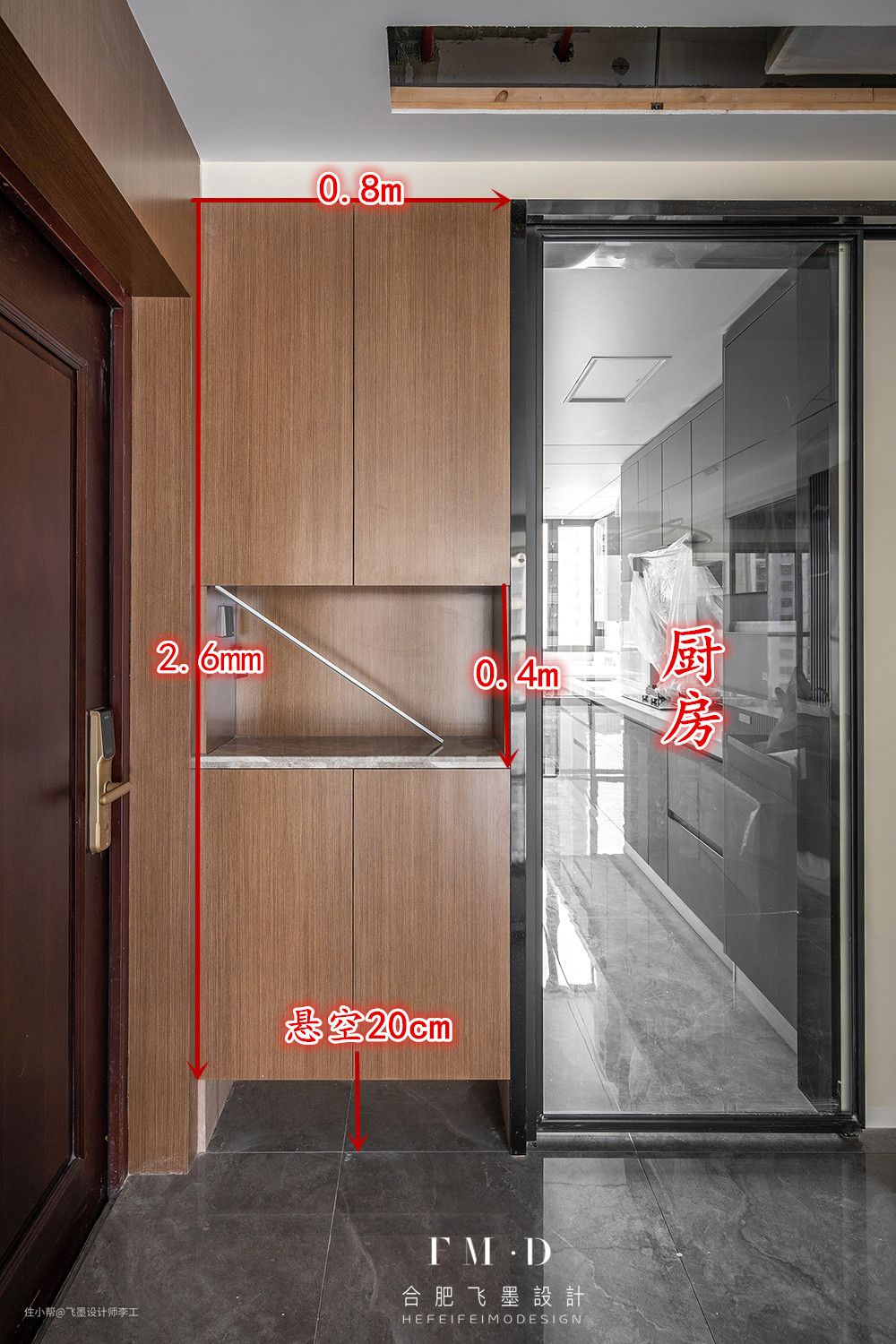 一推开门就能见到个嵌入式玄关柜,高2.6m,宽0.8m,上面储存换季的鞋子,常穿的鞋子放下面,拿取方便,中间空出40cm高的台面,装上插座平时还能充充电。