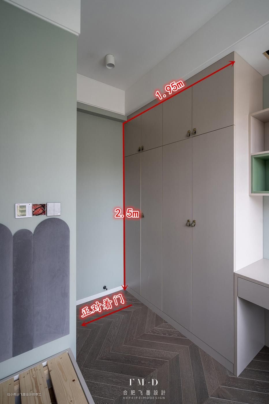 儿童房1面积一共9㎡,进门对面就是个大衣柜,长1.95m,高2.5m,小孩子的衣服可以直接挂里面,能省去很多麻烦。