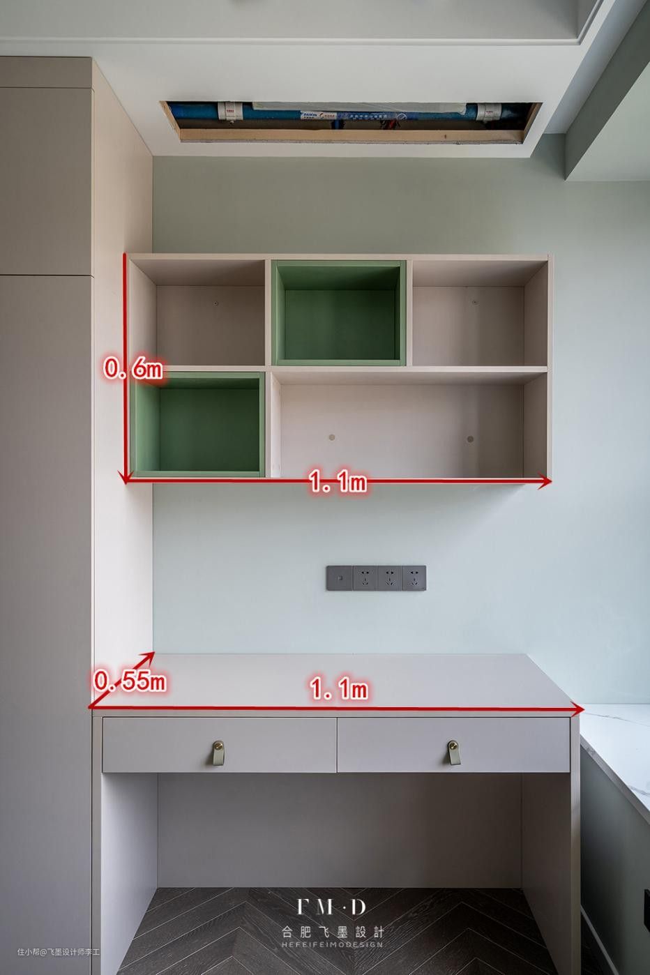 侧边设计个一体式书桌+书架,书桌长1.1m,宽55cm,而墙上的开放式书架高60cm,摆上书籍好看又方便拿取。