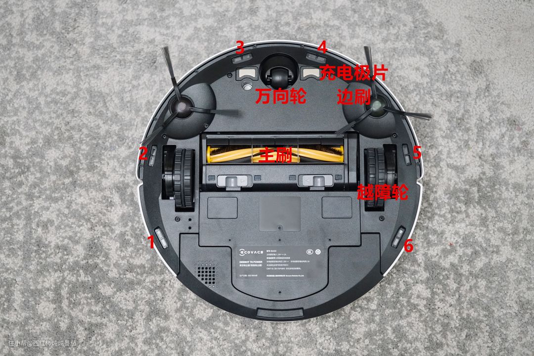 机器底部共配备了 6颗悬崖传感器,属于标准的旗舰级配置;主刷采用硬毛刷+胶刷组合设计,兼顾清洁效果和防缠绕性能 ▲