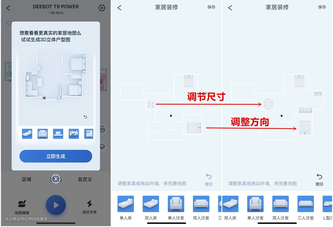 进入 3D地图后,可以看到机器人根据自己的识别系统,对家具位置和种类进行了初步填充。作为用户,则可以在该界面对家具进行方向调和尺寸方面的微调 ▲