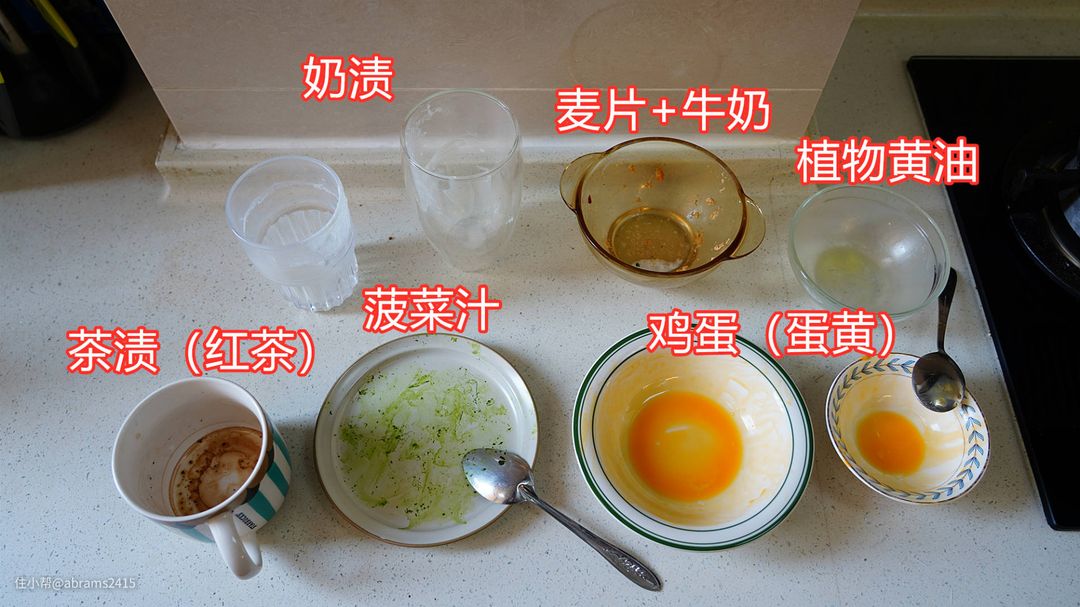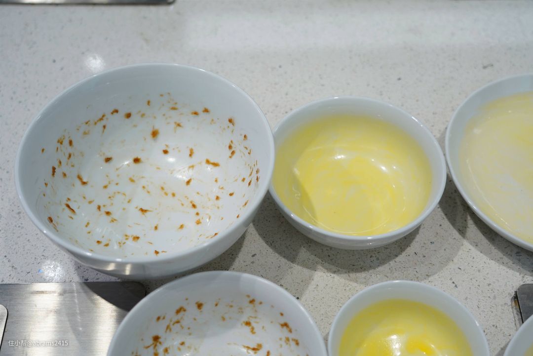 参照国标《GB/T 20290-2016 家用电动洗碗机性能测试方法》第6章节洗涤性能中6.2 污染物要求来制作了6大类污染物来测试这款洗碗机的洗涤性能。全部污渍用80℃烘烤1小时来增加洗涤难度。其中一些污染物如茶渍和菠菜汁即使手洗也非常困难。
