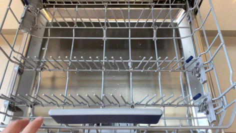 ▲最后,因为洗碗机正面无屏幕。导致洗涤过程中无法从屏幕上查看进度。这款洗碗机给出了一个解决方案:工作时在洗碗机底部投射蓝色LED灯光,代表此刻洗涤程序正在运行。当洗涤完成后,会通过声音提醒用户。同时投射光消失。