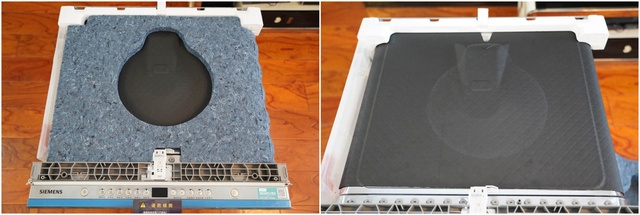 ▲作为全嵌入机型,机身顶部和侧面没有设计挡板。顶部由黑色止震胶覆盖,用来降低水流冲刷顶盖产生的噪音。再覆盖以保温棉进一步降低噪音和温度散失。