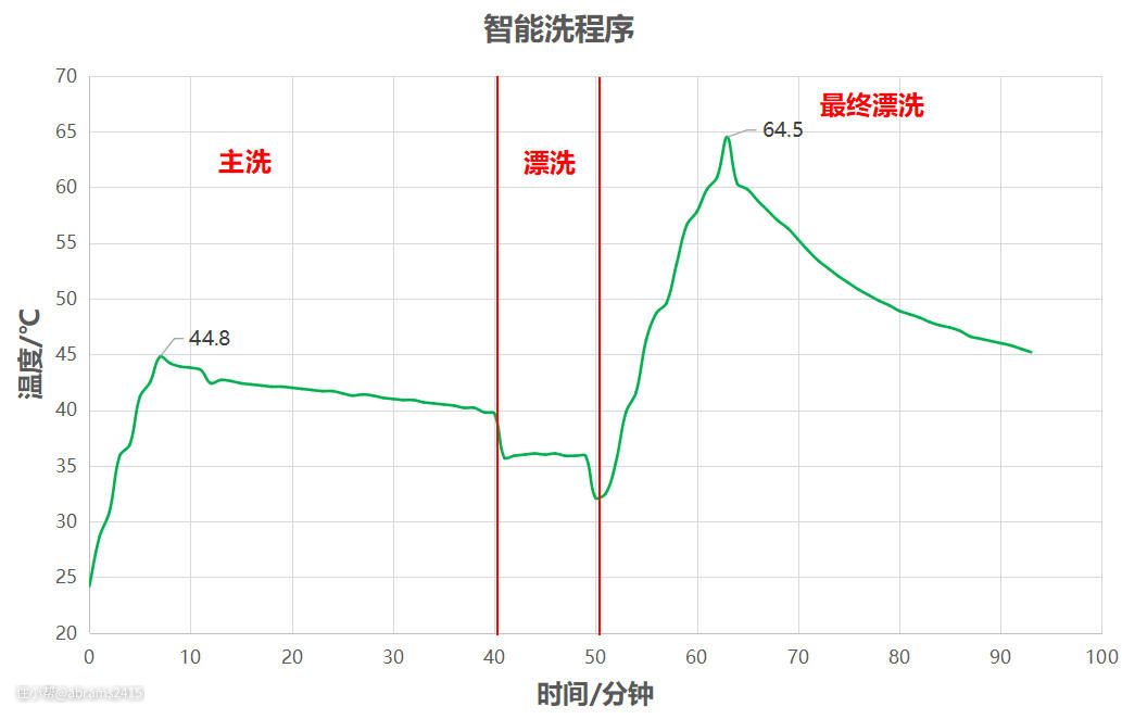 1、主洗阶段持续40分钟,水温最高44.8℃。洗涤剂中酶的活性在30分钟左右即可释放完全,从曲线来看,主洗阶段可充分释放酶的活性。