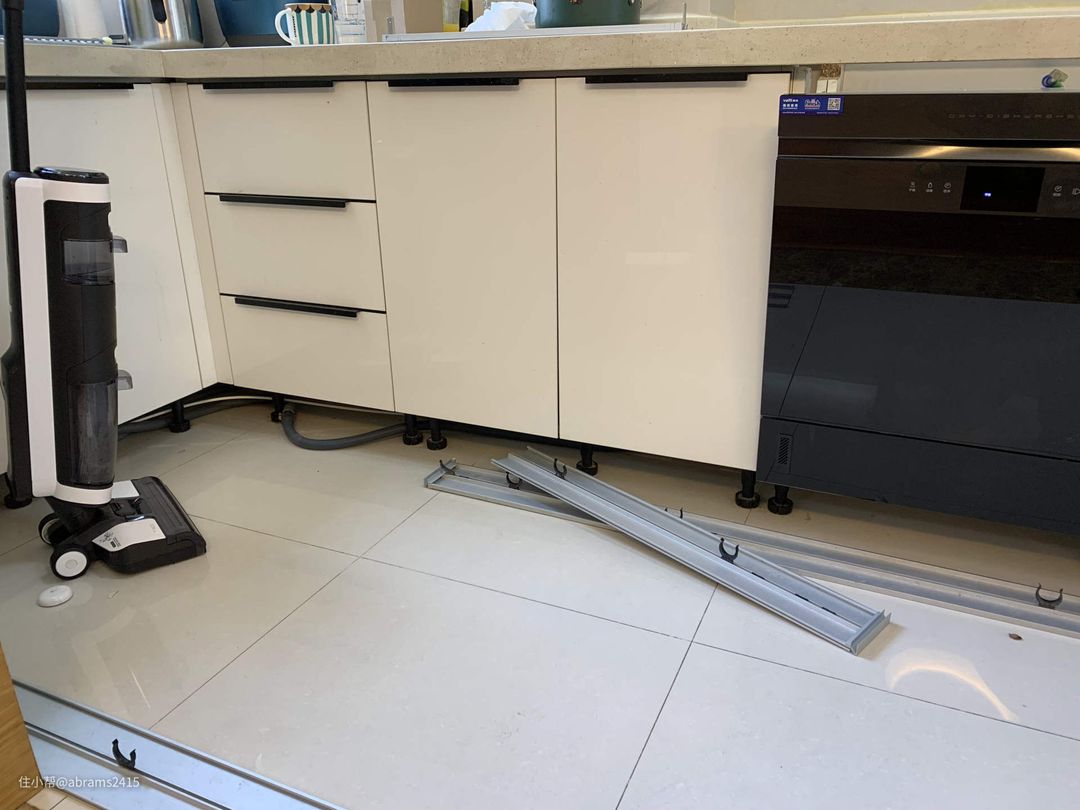 ▲之前安装过一台半嵌入式13套洗碗机,它的下方需把原来橱柜的踢脚线切断。这样破坏了一致性。而且我的橱柜下方是装回光灯的,这样回光灯必须切断。视觉效果也差了很多。