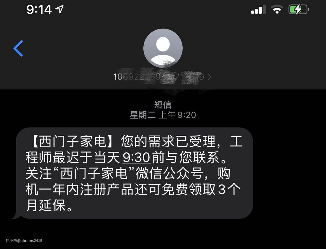 ▲购买当天西门子家电就发来了短信,通过回复数字安装师傅就能在约定时间上门安装。