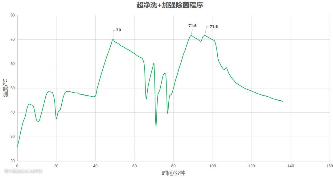▲布置一根K型热电偶在洗碗机内腔底部,数据记录仪每隔1分钟自动记录水温变化。从处理后的数据来看: