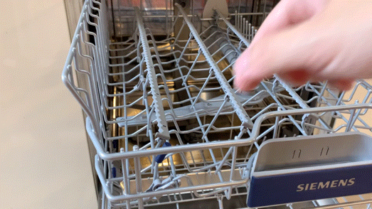 ▲上碗篮正前方SIEMENS logo处即是碗篮拉手也是洗涤剂助溶槽。当关上舱门后洗涤剂释放会正好落于该处,增加洗涤剂溶解速度。