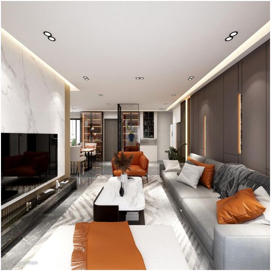 客厅|电视墙木饰加中间大理石面板,天然的纹理哑光的质感,与之对应的是沙发墙上金属材质的立体装饰品,在硬包背景墙的基础下,烘托出一种华丽精致的高级与档次感。奶灰色布艺沙发,搭配橙白灰色的抱枕和毛毯装饰,显得更加优雅情趣。客厅四周吊顶留灯槽设计,并在吊顶造型加入筒灯,与背景墙相同的花纹方形茶几,地面铺着素灰色的地毯,整个空间都充满现代端庄的高级感。