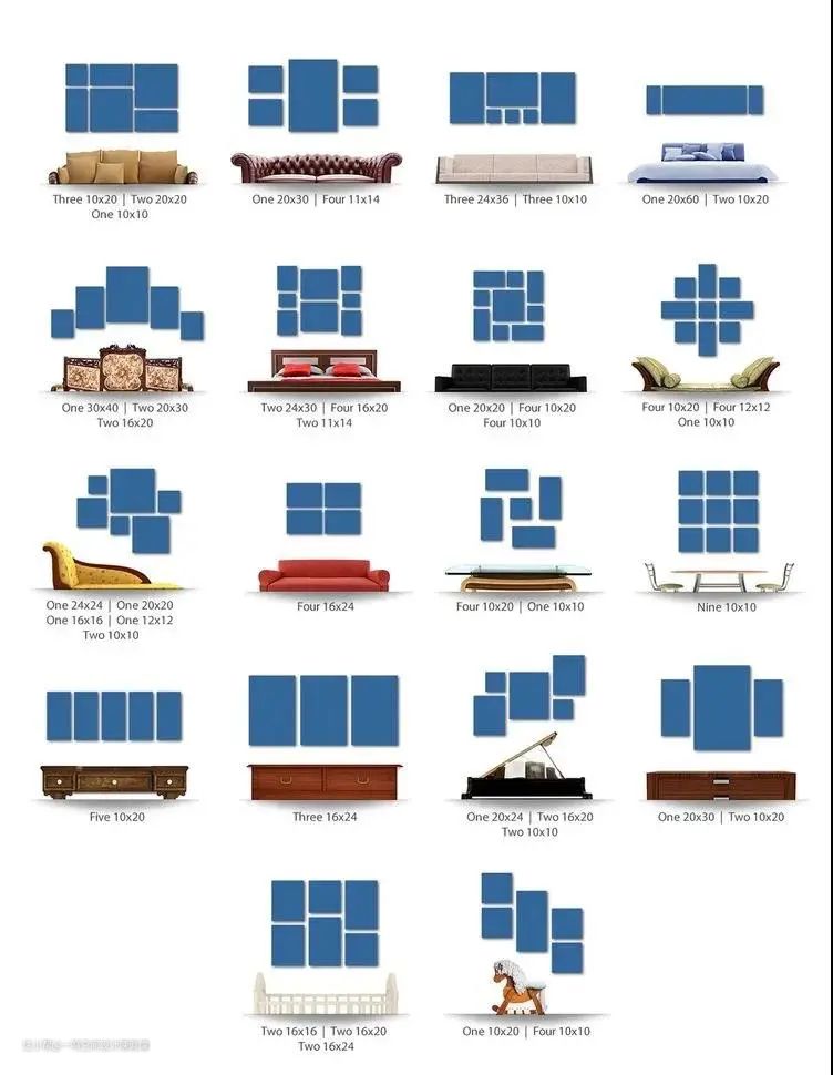 以直线为路径的矩阵排列法,一般是由两张及以上的挂画组成的组合。可以有几个尺寸进行组合,挂法一般都是有规律的。