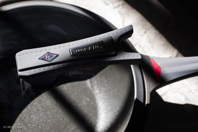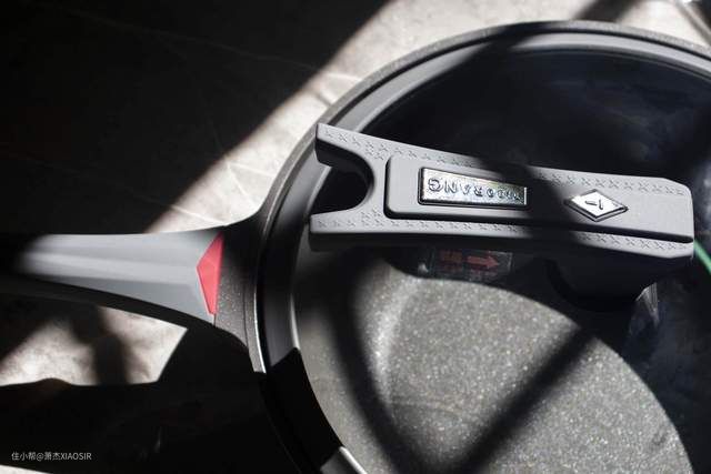 而它的重量上有1400g,相比一般不粘锅来说,轻便了很多,但是它的单柄把手达到了18cm,可以手部完全受力,轻松炒菜。
