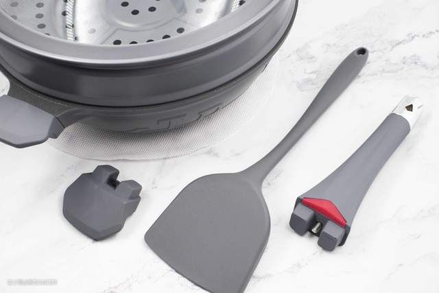 一个钢化微压锅盖、硅胶铲、蒸格、硅胶垫,还有两个电木锅耳。满足了我们在使用这口锅的时候,可以一锅多用,不仅仅是作为炒锅来用,平时也可以用过汤锅和火锅,方便又实用。