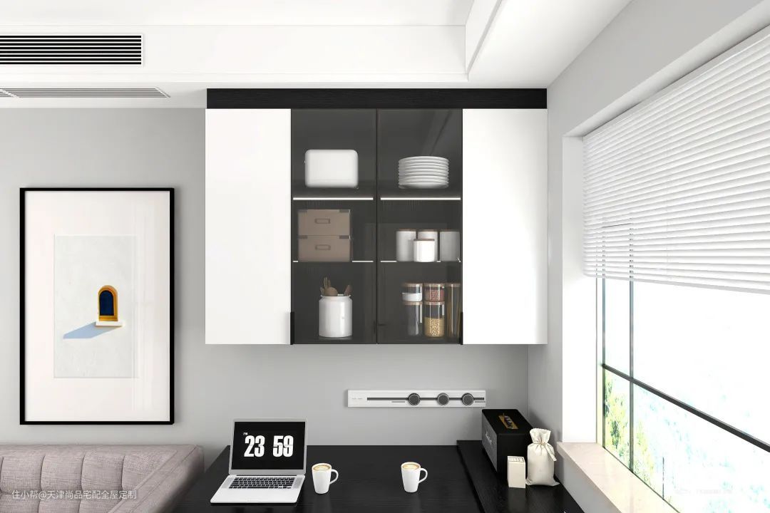 ▲墙上做吊柜增加收纳空间,玻璃柜门既防尘又能展示。靠近桌面预留轨道插座,用电更方便。