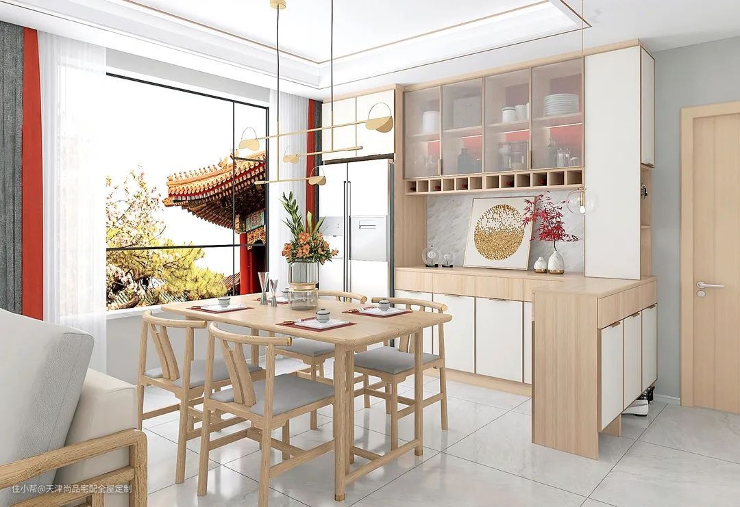 浅色实木设计,具有中国风特色,简单的4人座长方形餐桌,搭配靠背餐椅,一家人在这里吃饭超温馨。