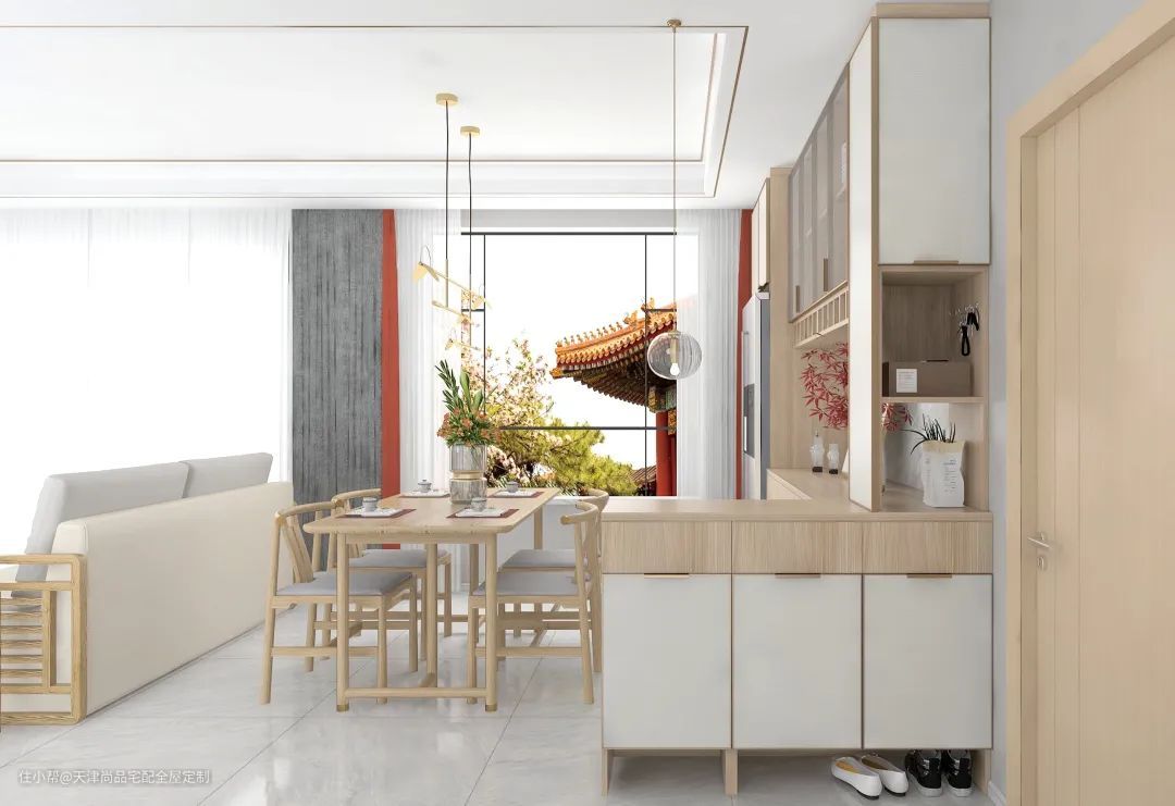 ▲新中式的餐厅,通过餐边柜与玄关柜拼接成L型布局,围出餐厅区域,客餐厅之间则用沙发隔断。