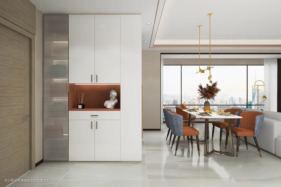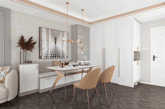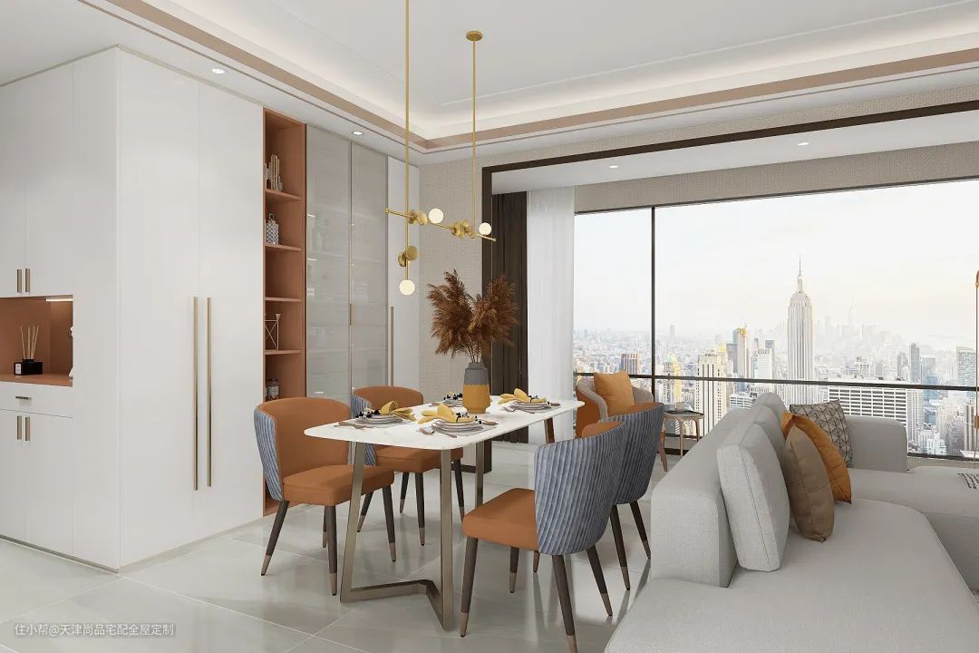 其实不管是大户型还是小户型,餐厅也要按需设计,空间不够就选择体积小、收纳功能强的家具,空间充足则注意合理布局,让餐厅更紧凑也更温馨。