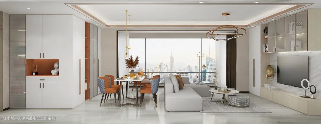 ▲客餐厅一体化设计,餐厅的布局也同样参考餐边柜+餐桌居中摆放的形式,与电视处于同一水平线上,如果除夕夜能一起吃着饭看春晚,一家人其乐融融,该有多幸福。