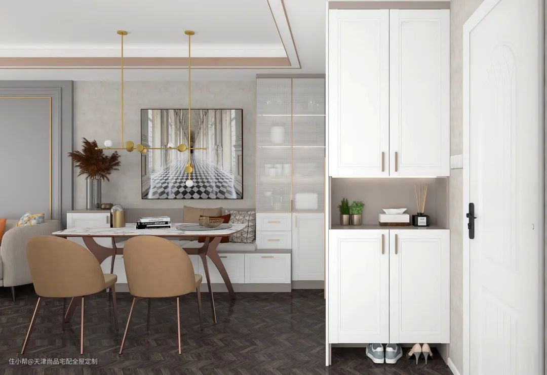 ▲进门打造玄关组合柜,隔出餐厅区域,靠近门的一侧则摆放日常用品,靠近餐厅一侧摆放不常穿的鞋子、行李箱或一些外套等等,收纳能力没得说!