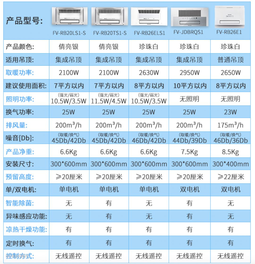 ▼以下是松下高端浴霸的列表,在预算在3000元左右时,我更推荐拥有全套松下黑科技的2个型号。2RB20TS1-S和JDBRQS1,它们都拥有松下的纳诺怡除菌技术、异味感知、智能除菌与冷热感干燥,而两者区别重要在JDBRQS1没有照明功能,但它使用了亚克力的装饰板,外观要更时尚。
