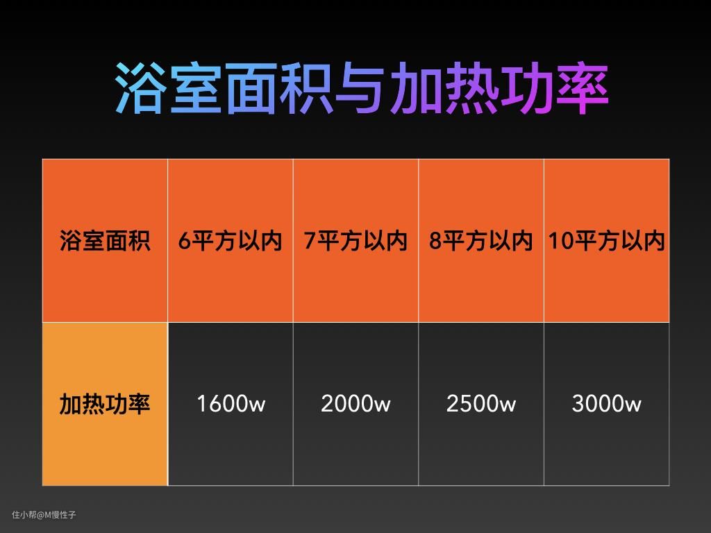 ▼关于风暖浴霸最重要的参数就是加热功率,以下是一个对应面积与功率的推荐,功率越高加热的速度越快。但功率也并非越大越好,要考虑到家中线路的负载。一般常规未改造房屋1.5平方的线路建议的负载在2000w以下,再大的功率就要考虑在装修时单独布置2.5-4平方的线路了。在预算和线路允许的情况下可以考虑3000w的机型。